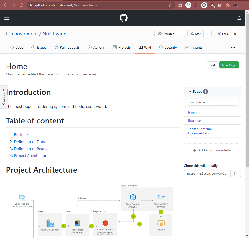 Documents to be read or edited by the Product Owner (or other members of the Scrum team) should be exposed through a Wiki. The advantage of this approach is that the writing experience in the Wiki is more friendly for non-developers. The Wiki should be sourced from the repo docs\ folder to ensure documentation is kept up-to-date. There are several options for creating a Wiki: