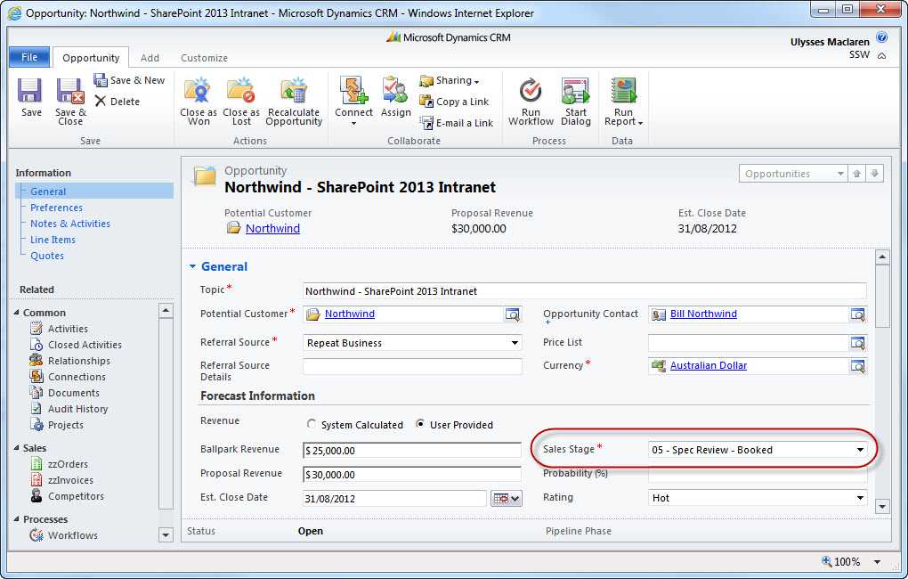 Figure: Good Example - CRM Record showing the sales stage of the Opportunity after the Spec Review has been booked