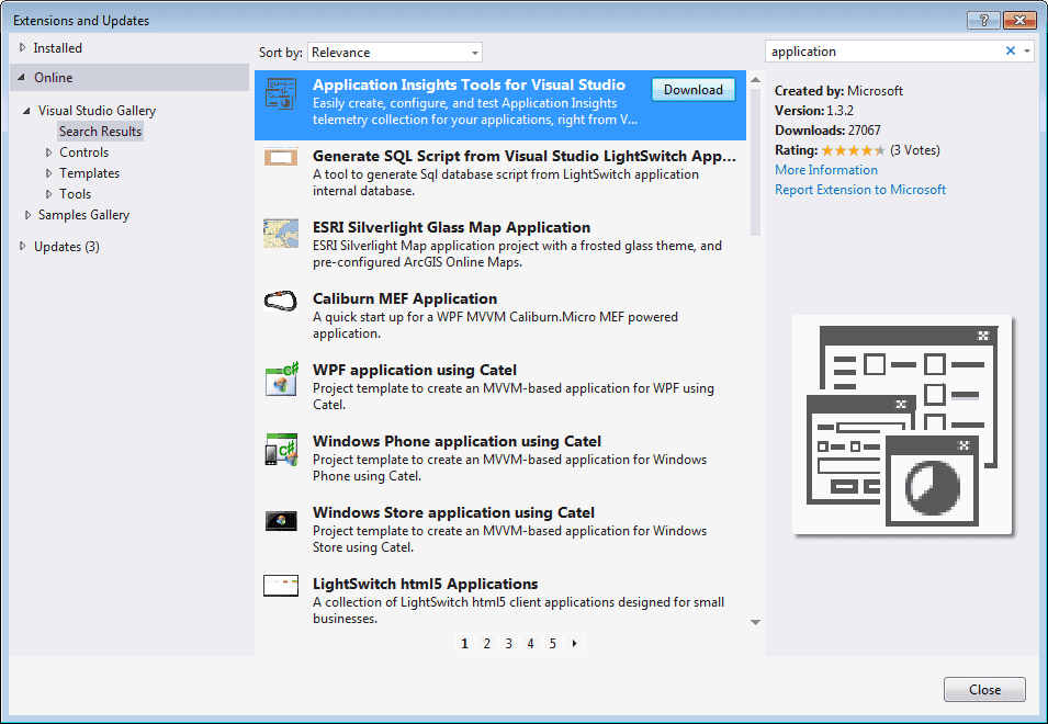 Figure: In Visual Studio, go to Tools | Extensions and Updates... and download Application Insights Tools for Visual Studio