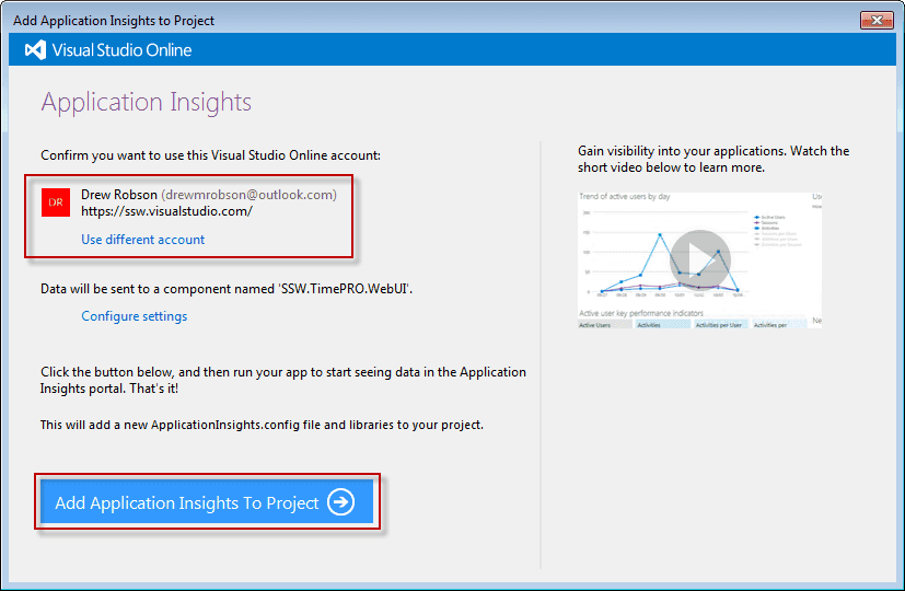 Figure: Sign in with your VSO account if required. Then click Add Application Insights To Project