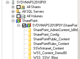 Figure: Notice that SharePoint protection only selects the SharePoint_Config and Content databases - Now browse to the SQL Server and add the entire SharePoint SQL Instance to the SharePoint Protection group. You will notice that you are unable to select some of the databases, as they are already being protected by SharePoint role protection.
