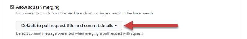 Figure: Repo Settings | Pull Requests | Allow squash merging, and change the value to "Default to pull request title and commit details" Limit merge types