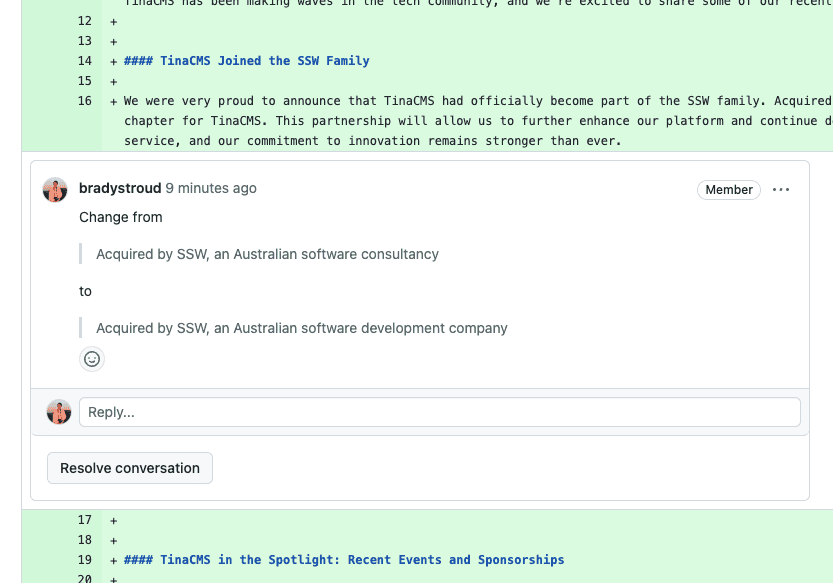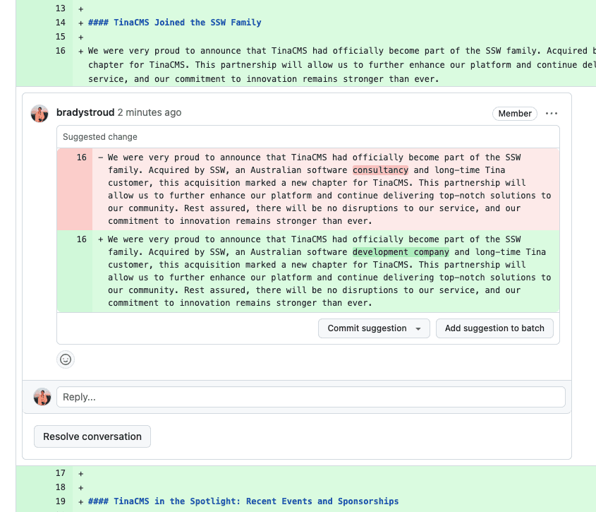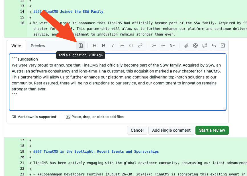 Video: Pull Request Suggestions | Brady Stroud | SSW Rules (4 min)Instead, reviewers should use GitHub's Add a suggestion feature. This allows the reviewer to directly suggest changes in the code diff view, and the PR creator can easily accept or reject these changes with a single click. This process is more streamlined and makes it easier to implement suggestions.