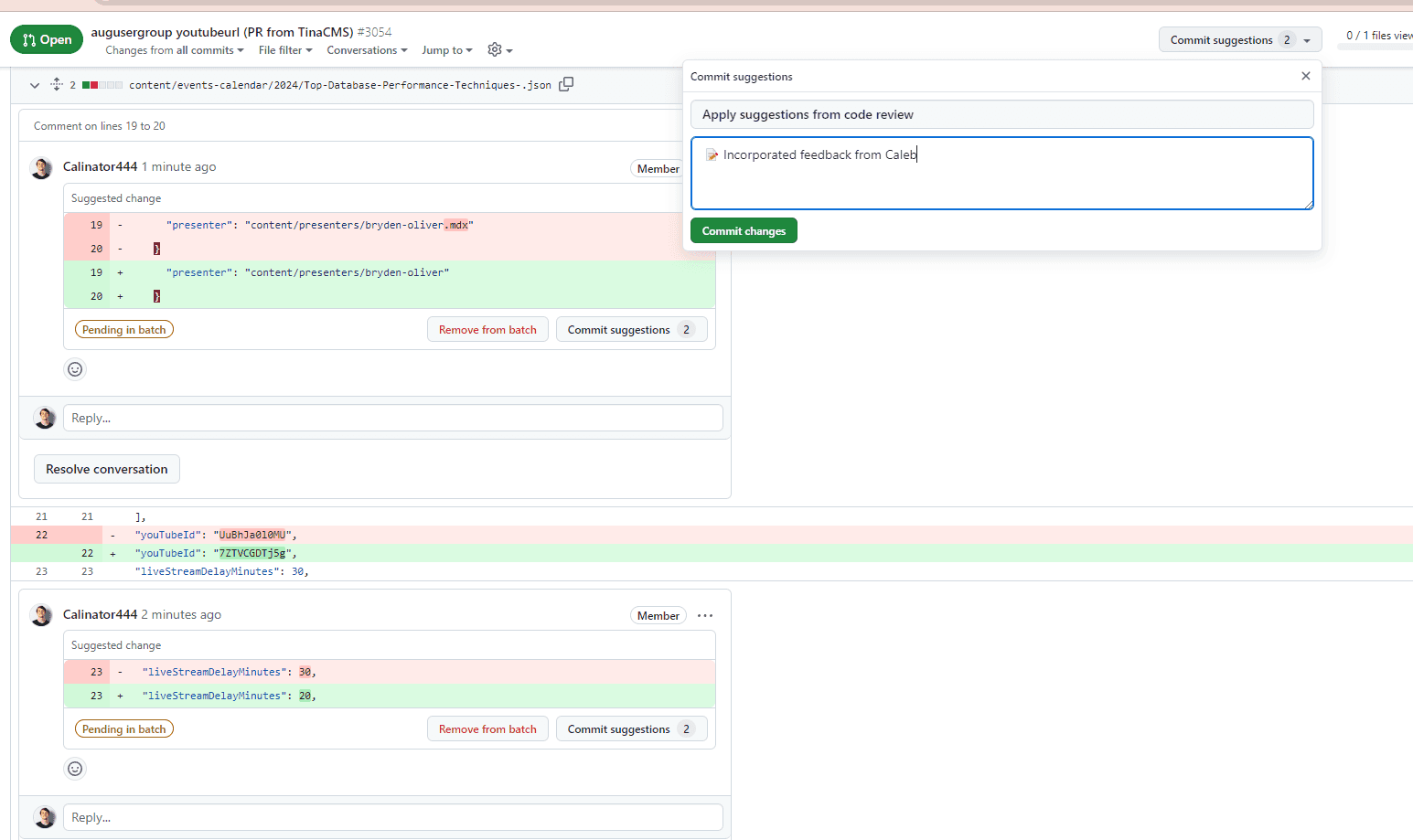 If an author has made multiple suggestions to your code it may be best to add the suggestions in a batch and then. This allows you to create a single useful commit message that summarizes the changes in the feedback.