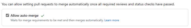 Figure: Repo Settings | Pull Requests, enable "Allow auto-merge" You may want to enable "Always suggest updating pull request branches", this can be done from Repo Settings | Pull Requests, this provides contributors with an easy way to update their branch from the target branch without performing the merge themselves on their local machine.