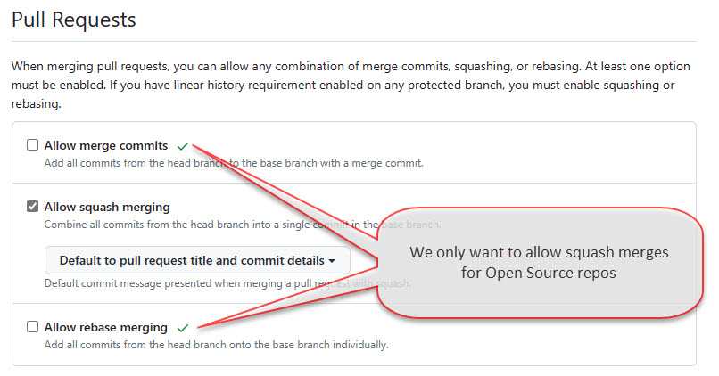 Figure: Repo Settings | Pull Requests, remove "Allow merge commits" and "Allow rebase merging" to force all PRs to be squash merged Automatically delete head branches