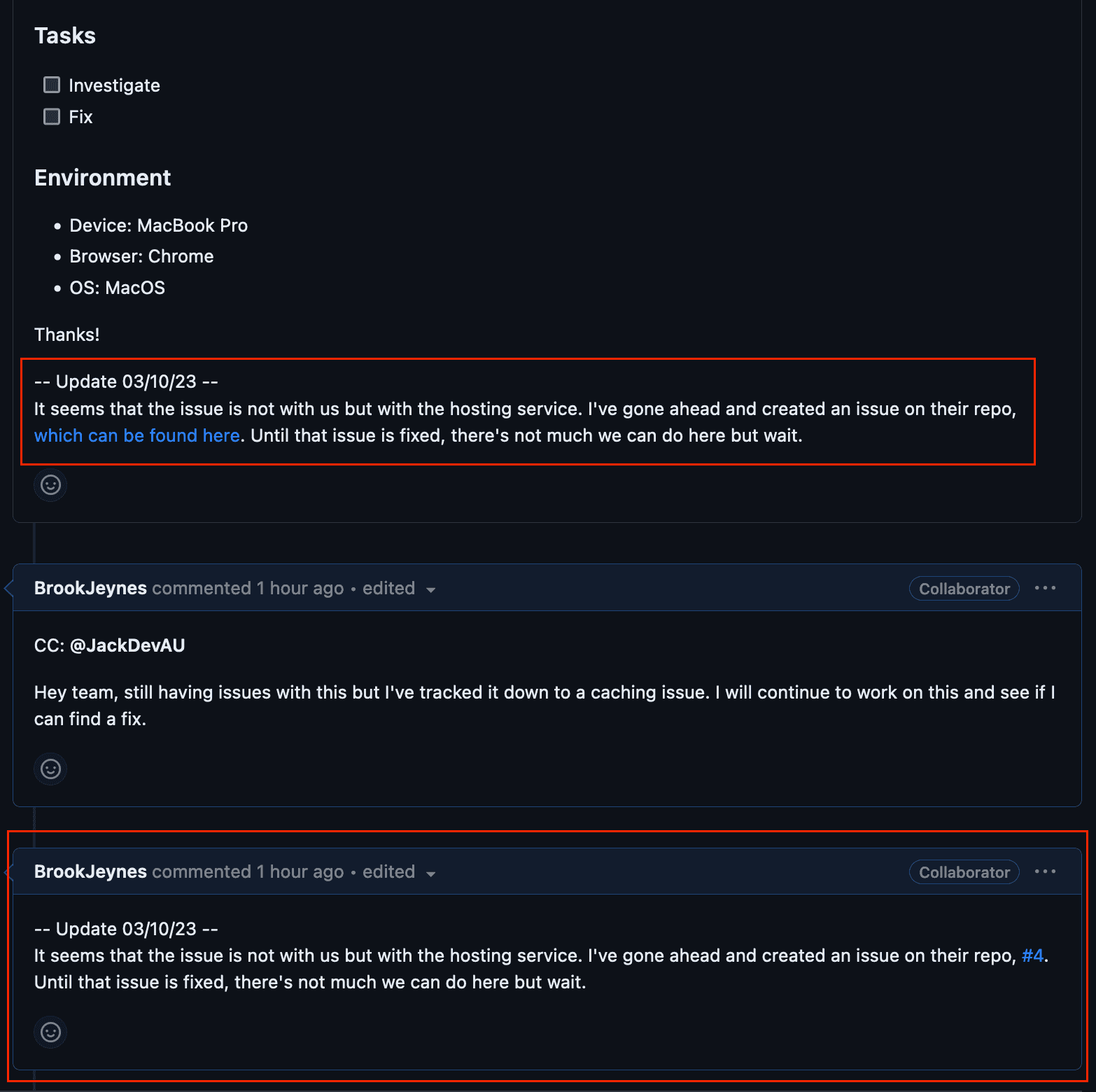 In cases where an update is long standing or important, it should be appended to the bottom of the issue description. This update must include the date it was made, serving as a chronological record of changes. In addition, a comment should be left on the issue thread to inform team members that significant information has been added to the issue.