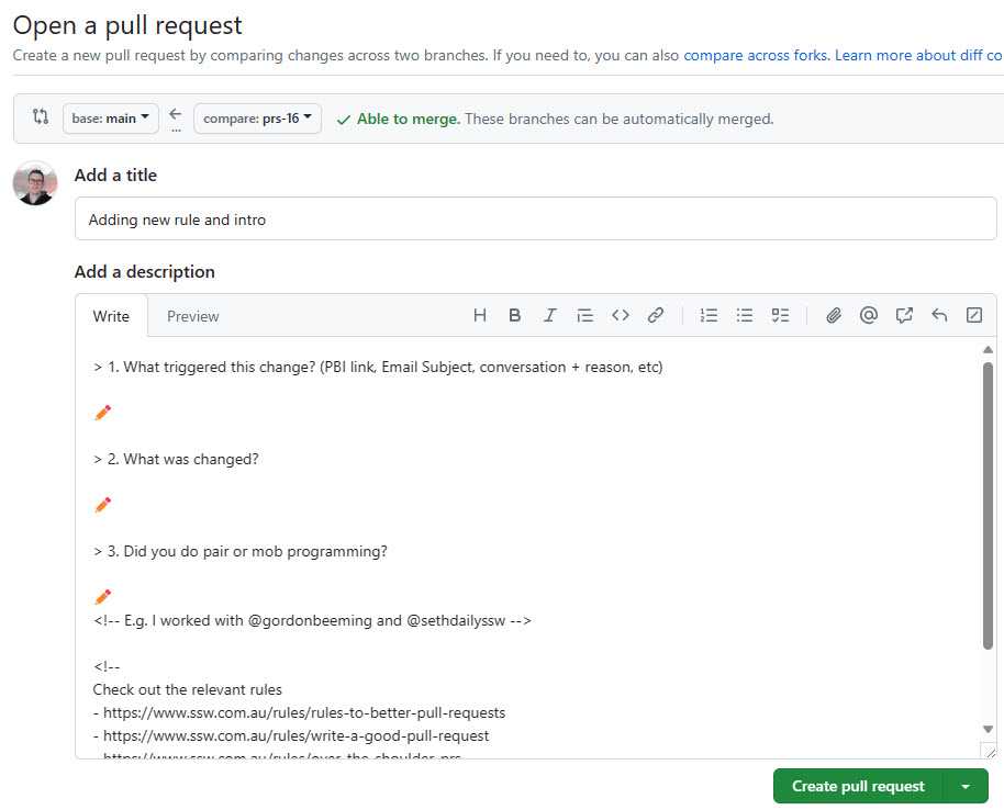 Figure: Good example - This PR template asks for context (to help reviewers), along with guidance links for creating great PRs ⭐ Tip: You can use comments in the Markdown as above. These comments will not show when the PR is created, and is only visible when editing the description.