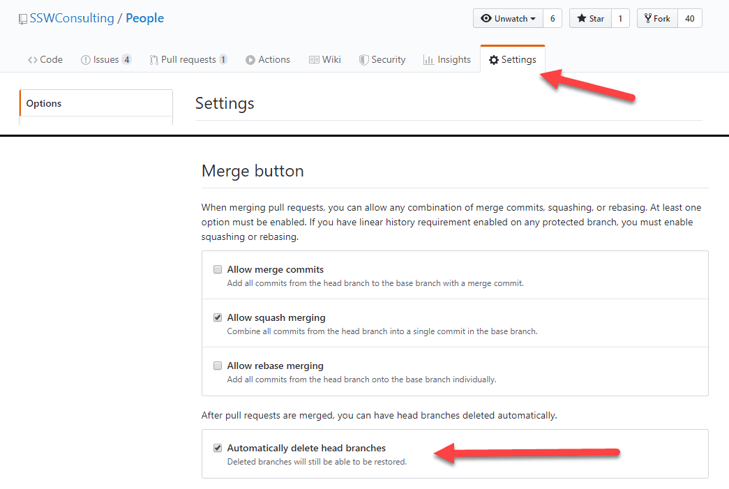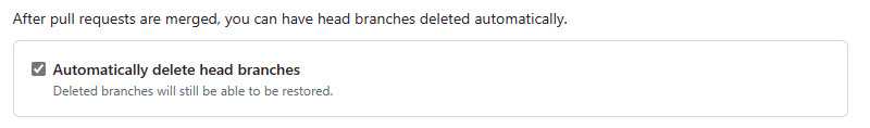 Figure: Repo Settings | Pull Requests, enable "Automatically delete head branches" to avoid stale branches Other configurations