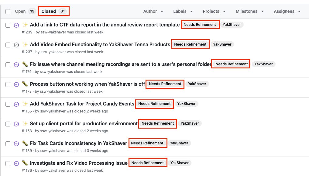 Needs Refinement, this reminds developers to review the issue to ensure that the details are correct. Once the review has been test passed, ensure that this label is removed, so that other team members know that it ready to be worked on.When to review a label