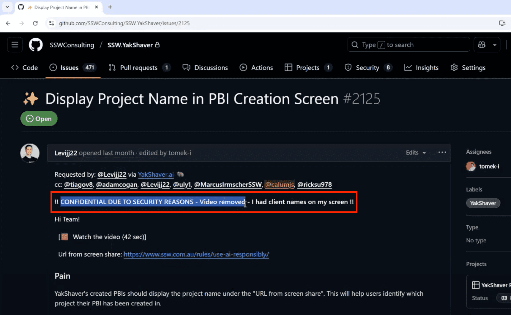 Finally, it's important to leave a transparent comment in the issue confirming that sensitive content was removed, and where it appeared (e.g. in a video, image, or text block).