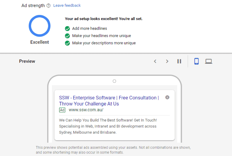 Make sure you use enough headlines and good descriptions to improve the strength of your ad