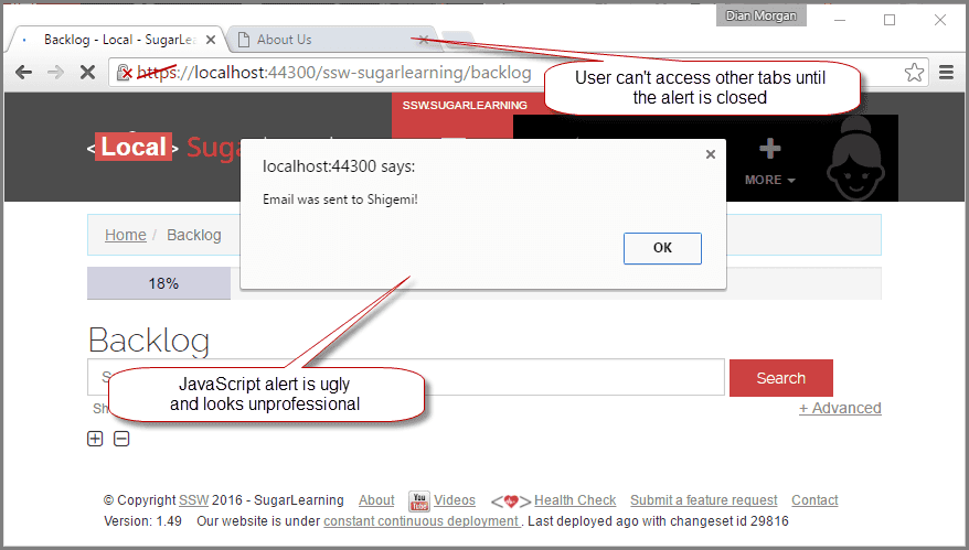 JavaScript alerts are evil. Not only are they ugly, they look unprofessional...