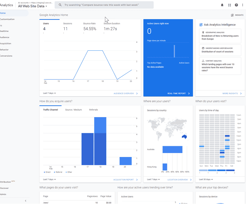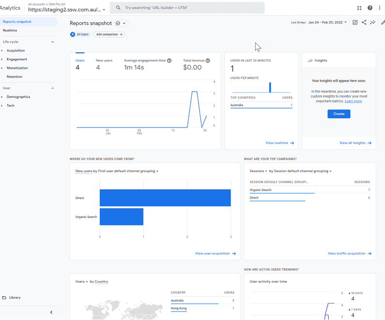 Figure: All tags are added in new SSW.Website using GTM Data and analytics result has recorded by Google Analytics on new SSW.Website. Universal Analytics and GA4 are configured in Google Tag Manager.