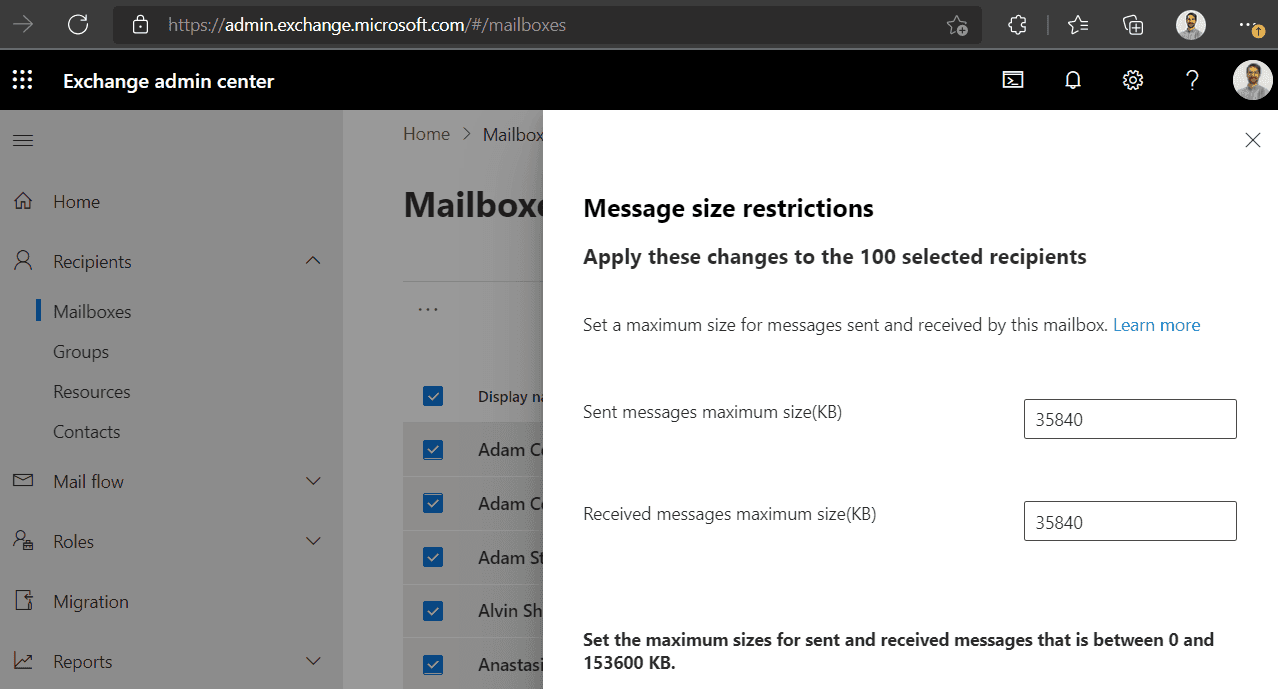- Go to Exchange admin center | Recipients | Mailboxes | Set default message size restrictions