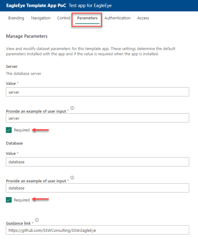 When creating the app, set the parameters default value in the "Parameters" pane and tick them off as "Required". The default values should go to the dummy database
