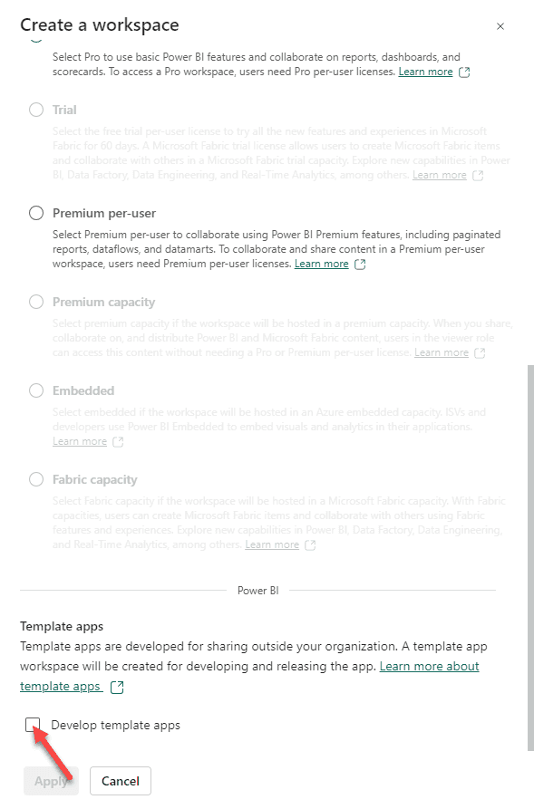* **Option A: Enable in Existing Workspace** 1. Navigate to your Power BI workspace settings 2. Ensure the "Develop Template Apps" option is enabled