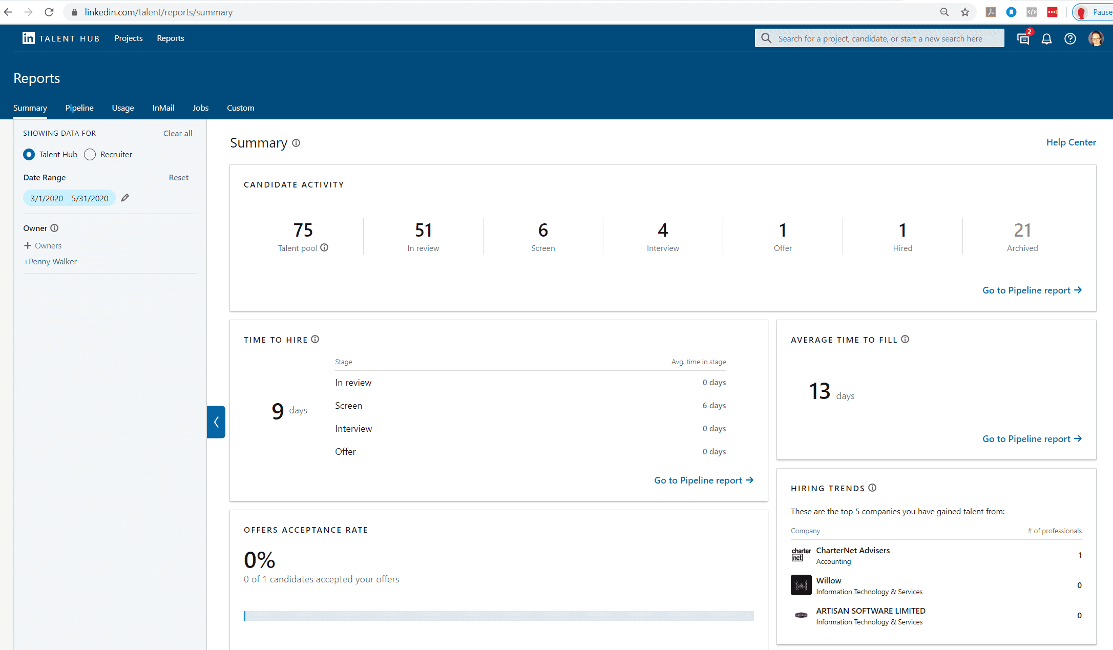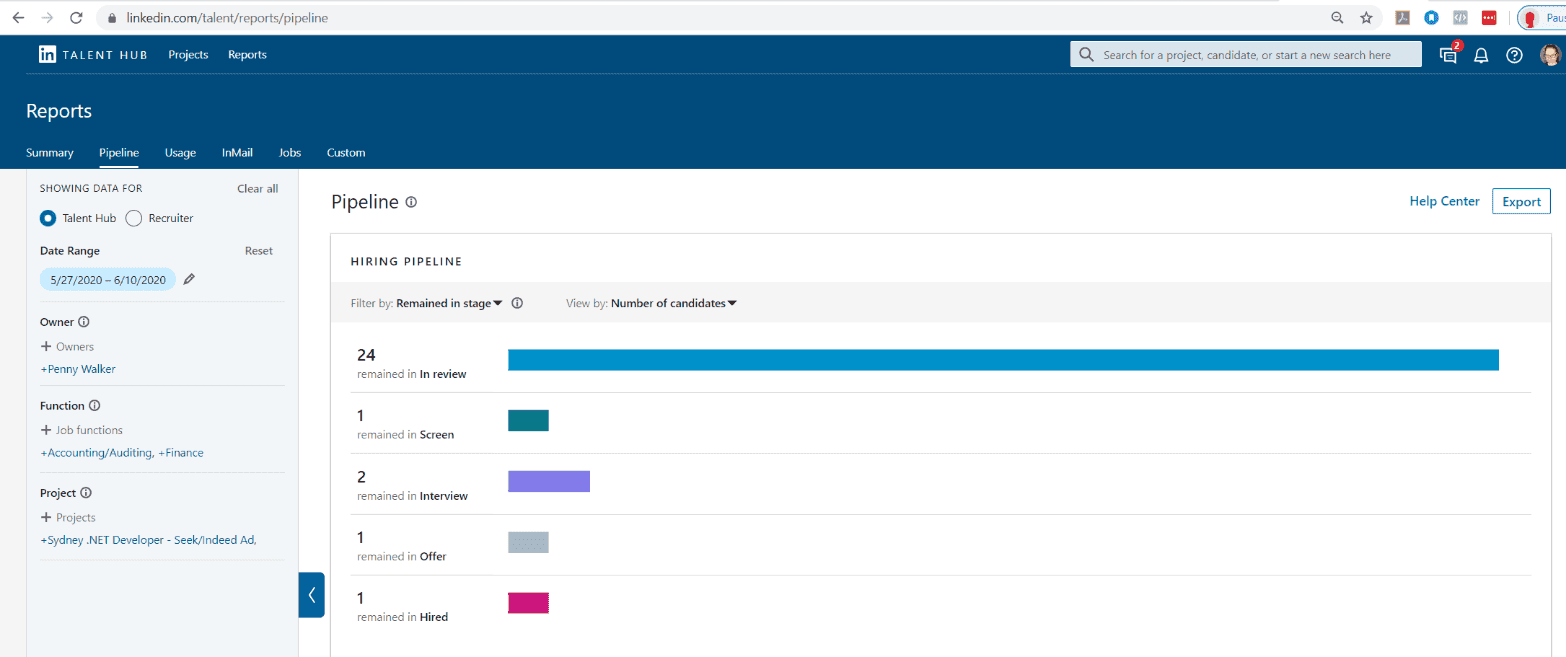 Figure: LinkedIn Hub that is used alongside LinkedIn Recruiter You can see how many candidates go into your pipeline, how many make it to each stage of your recruitment process, and how long it takes at each stage, including the “time to hire”. This should show how efficient your process is, and if you lose too many candidates at certain stages in your process.