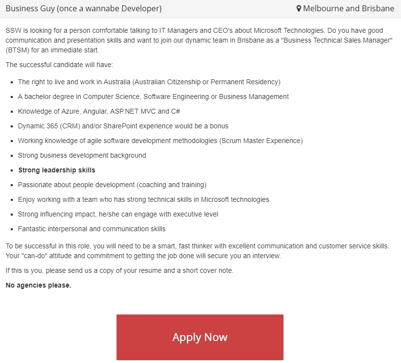 We also try to make our ads interesting and fun to help them stand out. For example, when we needed a new State Manager for Brisbane, we wanted someone with a Business mind, who also knew our industry inside and out. So we created the title "A Business Guy (once a wannabe developer)". This got people's attention, and got us the right person for the job!