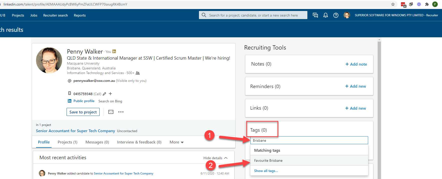 You can then use your tags on the profiles of your candidates to show what action has taken place: