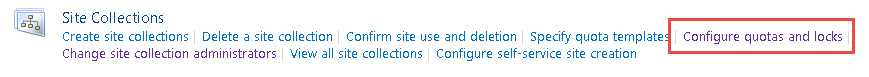 - Open SharePoint Central Administration site, navigate to "Application Management " | "Site Collections " | " Configure quotas and locks ".