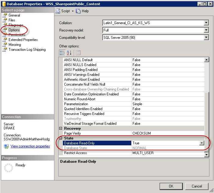 Figure - Database Properties | Options | Database-Read Only - Now it’s safe to take a backup of your content database