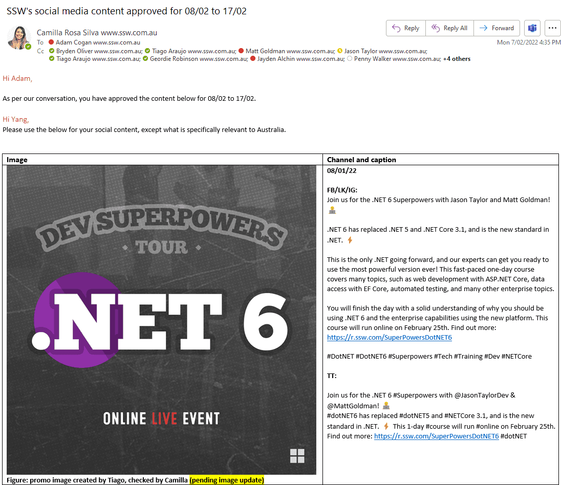 Figure: Example of a template you can use to get approval for your social media content, note it shows what platforms it will be posted on, when, the test and how it will look. It will also help give you an idea of what your feed will look like to ensure it has a nice balance of images In this age of misinformation, it is easy to get swept up in online hype and share stories/posts that everyone else seems to be sharing. This, however, can get us into trouble as it can perpetuate said misinformation and impact how a situation is viewed by the general populace.