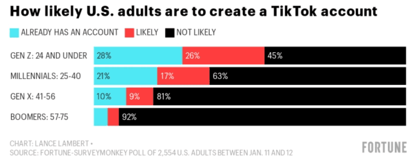 Figure: TikTok is popular among teenagers, according to Fortune 55% (28%+26%) are 24 and under Source: TikTok to the moon? The app is outgrowing its Gen Z stereotype