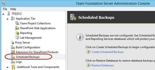 Tip: The Team Foundation Server Team Foundation Server 2012 Update 2 and above has a built in Scheduled Backup tool which helps you to easily backup all TFS Databases. For versions prior to TFS 2012 Update 2 you have to use Backups tool from the TFS Power Tools package.