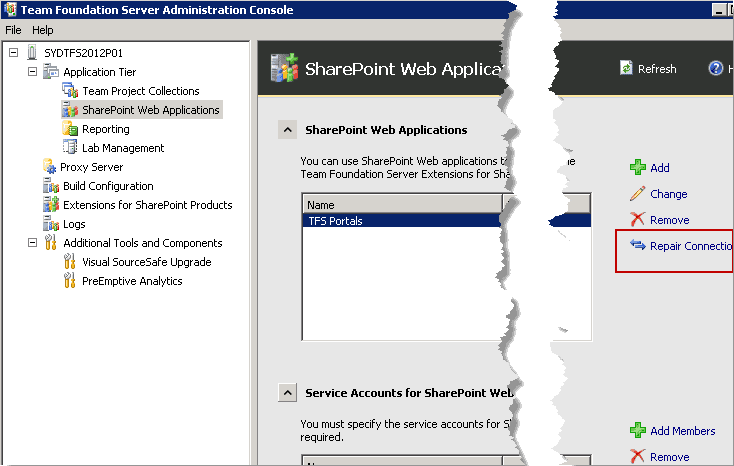 - Check your SharePoint servers. You'll need to install the latest SharePoint Extensions and make sure you repair your SharePoint connections in the Configuration Manager of your TFS Server