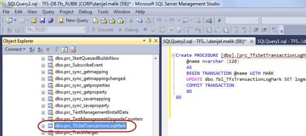 Figure: Add sp_SetTransactionLogMark stored procedure to every Tfs_* Database If you manually backup the TFS Databases make sure you add additional jobs that execute 1 minute before the backup kick off.