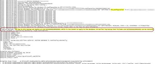 Figure: TFS Backup tool failed to restore the Tfs_Configuration DB – known bug in TFS 2012 Power Tools RTM In such case you will have to manually backup databases. Make sure all relevant databases have been backed up. This includes all those starting with "Tfs_"