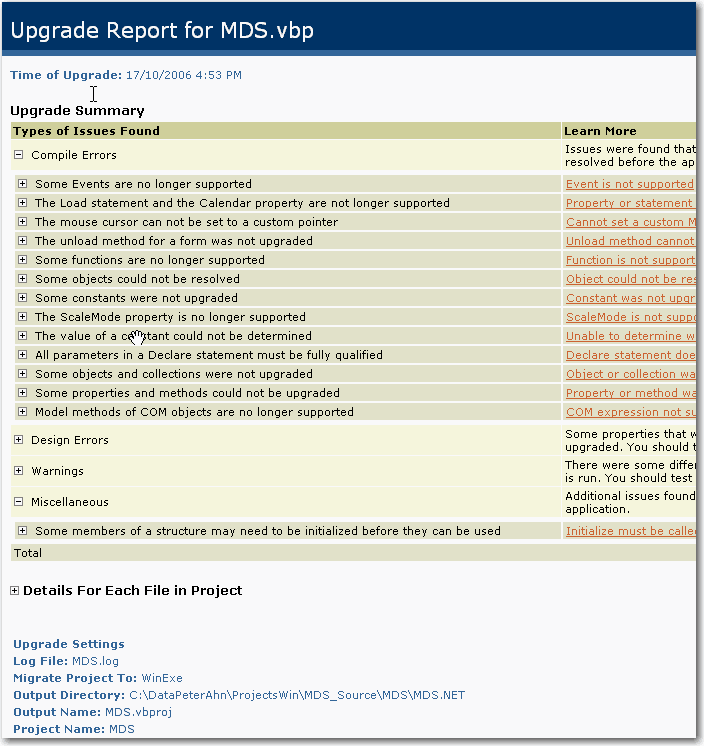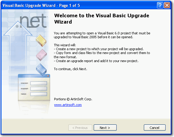 Figure: VB 6 Upgrade Assessment Tool The Visual Basic Upgrade Wizard is a great place to start converting to VS.NET 2005 process. The upgrade happens automatically when you open a Visual Basic 6.0 project in Visual Basic 2005: the Upgrade Wizard steps you through the upgrade process and creates a new Visual Basic 2005 project.