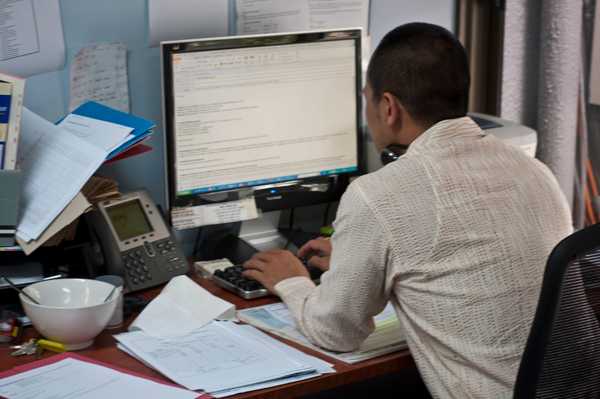 Busy environment - Recording in a busy office with harsh fluorescent lights with background chatter and unpredictable changes to the ambient workspace volume and background elements