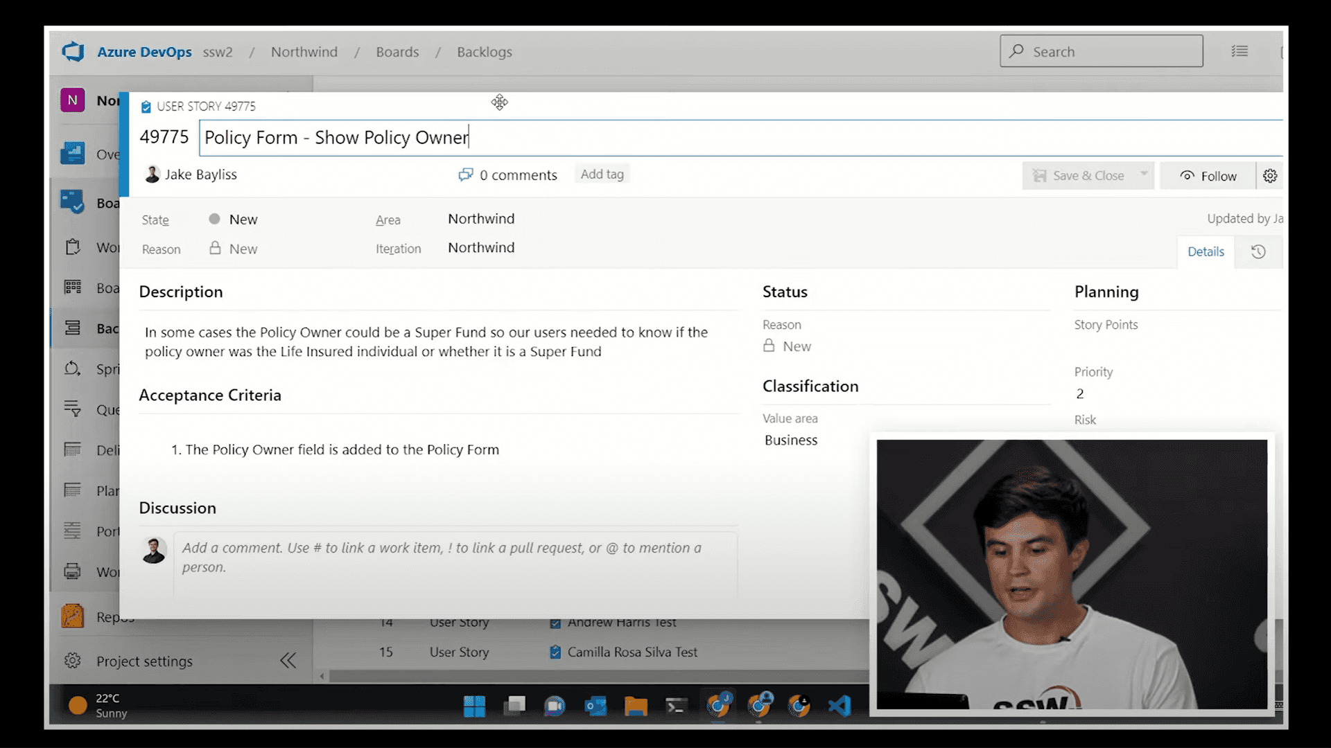 - Provide an overview of the PBI you are going to discuss, remembering to zoom out before showing code samples or demos (see rule - Do you zoom out then in)