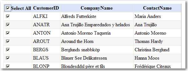 Figure: Select all checkboxes in a web form <script type="text/javascript"> function SeleteCheckBox() { for (var n=0; n < document.form1.elements.length; n++) { if (document.form1.elements[n].type == "checkbox" && document.form1.elements[n].name == "gridview") { document.form1.elements[n].checked = document.getElementById("CheckBoxAll").checked; } } } </script>Code: Code for selecting all checkboxes in a web formWe have suggestions for Visual Studio .NET about this at A top CheckBox to "select all" in windows forms and A top CheckBox to "select all" in web forms.