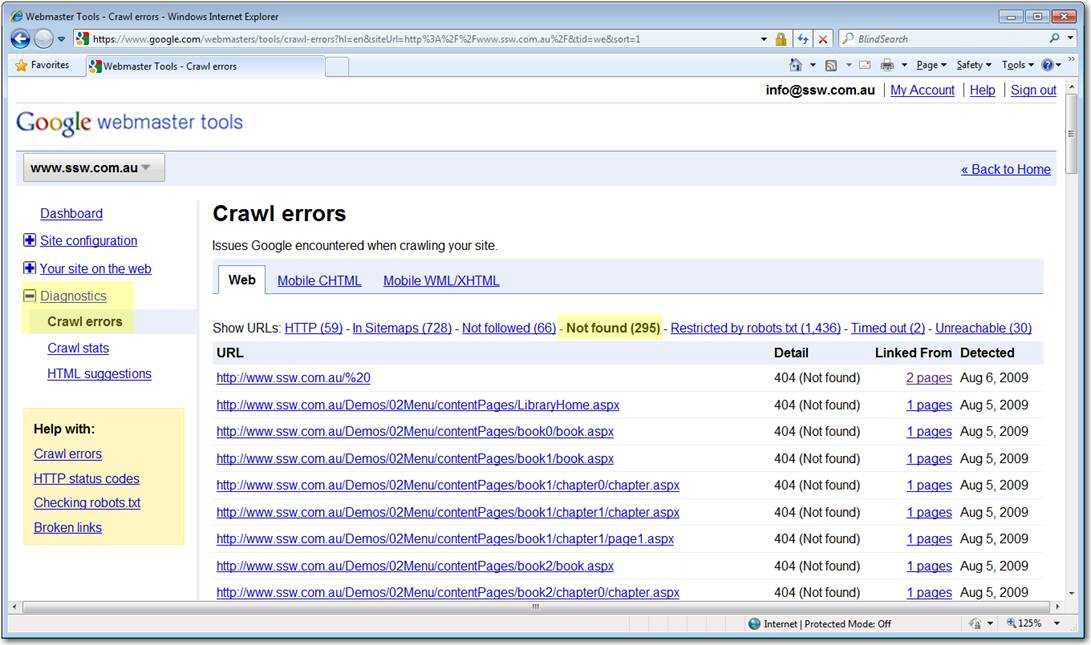 Figure: In Google webmaster tools you can see all broken URLs, and even the pages who are linking to them (known as referrer, found in the 'Linked From' column)