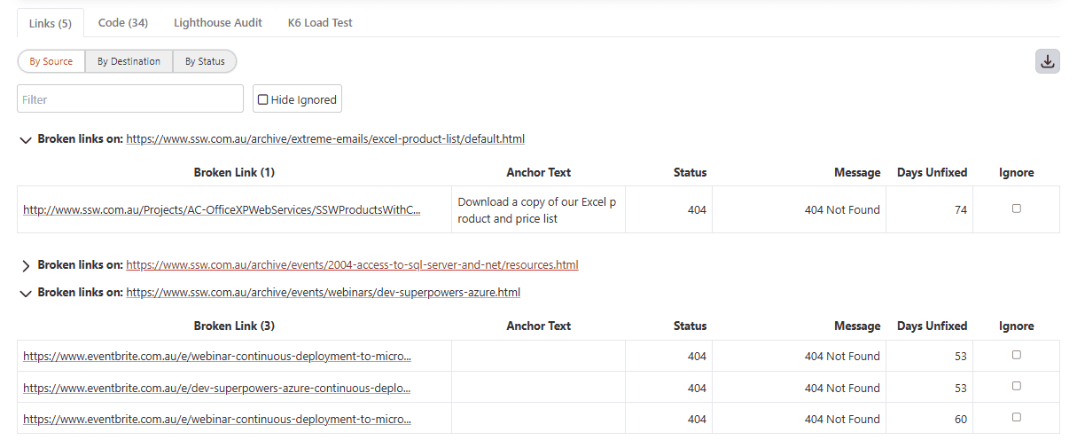 Broken Links in the dashboard are displayed with their corresponding anchor text to give you some context about the page