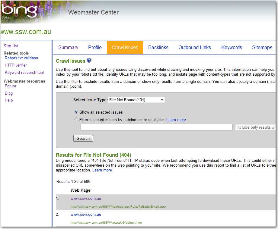 Figure: In Bing webmaster centre you can find the broken URL which is linked by the above URL