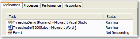 Figure: Bad example - Unresponsive UI because no threading code private void Form1_Load(object sender, EventArgs e) { this.ValidateSQLAndCheckVersion();// a long task }Code: No threading code for long task