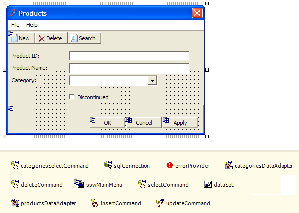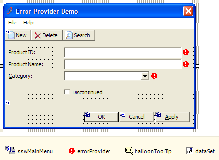 Private Sub productNameTextBox_Validating(ByVal sender As Object, _ ByVal e As System.ComponentModel.CancelEventArgs) Handles _ productNameTextBox.Validating ValidateProductName(False) End Sub Private Function ValidateProductName(ByVal force As Boolean) _ As Boolean If Me.productNameTextBox.Text.Length = 0 Then Me.errorProvider.SetError(Me.productNameTextBox, "You must enter the Product Name.") If force Then MessageBox.Show("You must enter the Product Name.", _ Me.Text, MessageBoxButtons.OK, MessageBoxIcon.Warning) End If Return False Else Me.errorProvider.SetError(Me.productNameTextBox, _ String.Empty) Return True End If End Function Private Function ValidateInput() As Boolean Dim force As Boolean = True Dim isValid As Boolean = ValidateProductID(force) If Not isValid Then force = False End If isValid = ValidateProductName(force) If Not isValid Then force = False End If isValid = ValidateCategory(force) Return isValid End Function Private Sub okButton_Click(ByVal sender As Object, _ ByVal e As System.EventArgs) If Me.ValidateInput() Then 'Test End If End SubFigure: Bad example - lots of code but no balloon tooltips