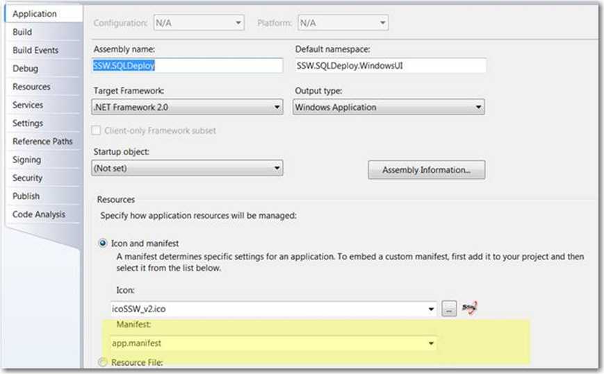 Figure: Use the newly created App.Manifest It can be extremely tiresome to have to continually remember to set and unset the wait cursor for an application. If an exception occurs you have to remember to add a try finally block to restore the cursor, or if you popup a message box you must remember to change the cursor first otherwise the user will just sit there thinking the application is busy.