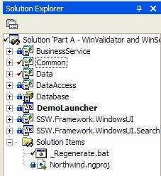Figure: The _Regenerate.bat file under solution items The built in Data Form Wizard in Visual Studio .NET is not any good. We prefer other code generators like CodeSmith - Good for generating strongly-typed collections.