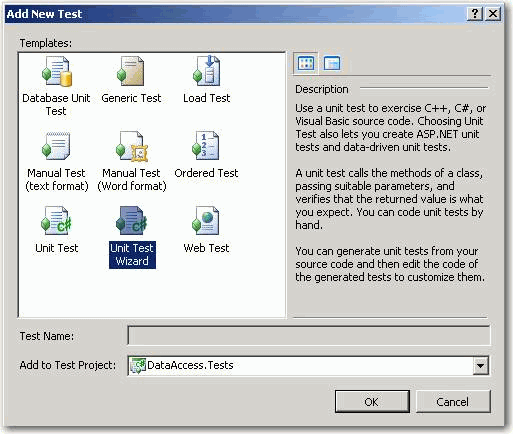 Tip: You can create a test project using the Unit Test Wizard: Test > Add New Test